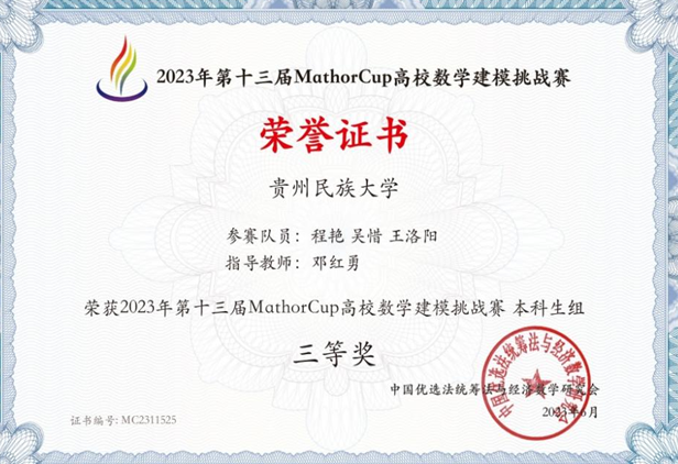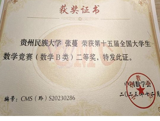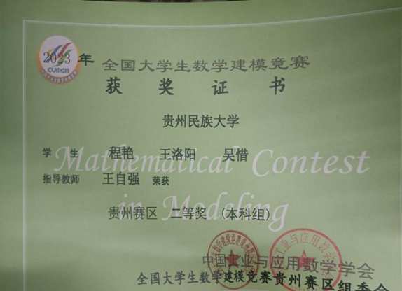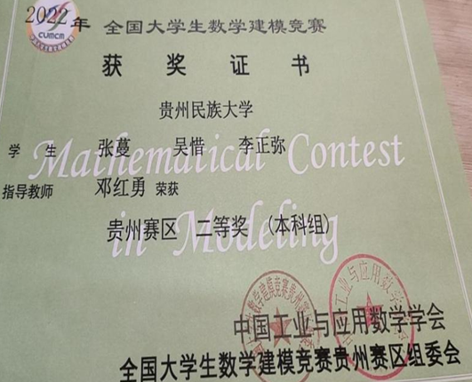 在校期间努力学习,获得不错的成绩,获得一次校级二等奖,一次单项奖学金,并获得校级三好学生荣誉,并在学科竞赛中取得不错的成绩,在2023年第十三届MathorCup高校数学建模竞赛中获得三等奖,以及在2023年全国大学生数学建模竞赛中获得省级二等奖。并通过了英语四级,普通话等证书。