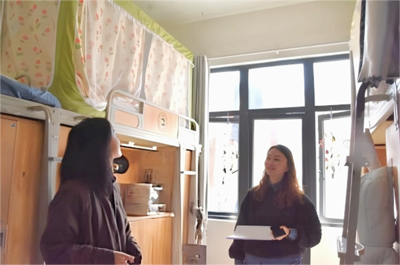 评选工作由学院党委书记刘璐、党委副书记赵孝梨带队,辅导员和学院学生骨干、学生代表组成的评审组共同完成。评审组深入各参评宿舍进行综合考察,以宿舍基础卫生、物品收纳与用电安全等日常管理情况为基础,重点考察各宿舍的文化特色、氛围营造及成员精神风貌,并与同学们亲切交流,了解其日常学习生活与宿舍建设心得。整个过程坚持公平、公正、公开的原则,既细致排查了安全隐患,也充分肯定了各宿舍在环境美化与文化建设上的巧思,对发现的问题现场指导并督促整改。最终,一批内务整洁、特色鲜明、团结向上的宿舍脱颖而出,获评院级文明宿舍。