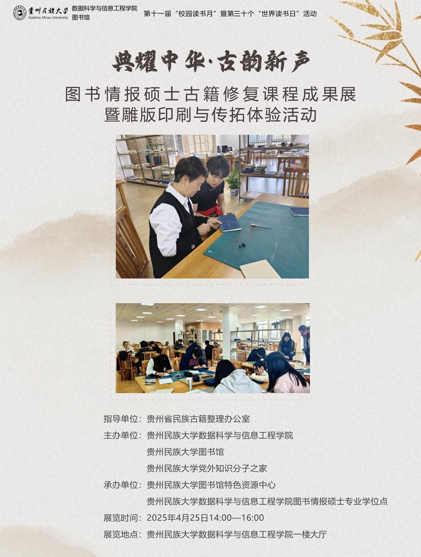 这个春天,我们以书为媒,与古对话。4月25日,“典耀中华·古韵新声”图书情报硕士古籍修复课程成果展暨雕版印刷与传拓体验活动即将启幕,带你沉浸式感受古籍修复的匠心之美!