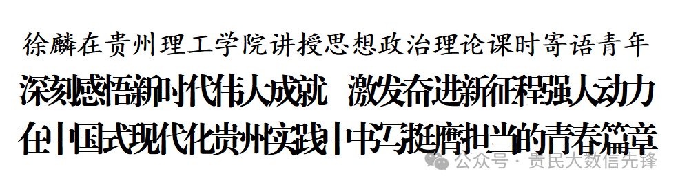 11月20日,省委书记、省人大常委会主任徐麟到贵州理工学院讲授思想政治理论课,深入学习贯彻党的二十届三中全会精神和习近平总书记视察贵州重要讲话精神,寄语全省广大青年深刻感悟新时代伟大成就,激发奋进新征程强大动力,在中国式现代化贵州实践中书写挺膺担当的青春篇章。