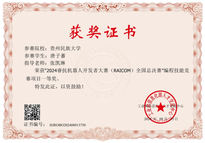 在2024睿抗机器人开发者大赛(RAICOM)全国总决赛中,由张凯琳老师指导的248cc永利集团唐子蕃同学,在编程技能竞赛项目上表现出色,成绩优异,荣获国家级一等奖,为学校争得了荣誉,充分展现了永利集团官网248cc永利集团学子的风采。此外,本次赛事学院还获得了国家级二等奖3项、三等奖15项,省级一等奖8项、二等奖19项、三等奖35项的优异成绩。